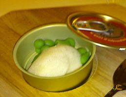 >>> Les petits pois reconstitués: Eine nichtssagende Mousse aus Erbschen, geformt wie Erbsen-Kügelchen mit etwas Milchschaum überzogen, serviert in einer Büchse mit Veyrat-Bild auf dem Deckel; nicht einmal unser Hund muß sein Futter aus der Büchse fressen ... |