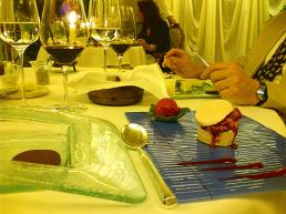 >>> Damit deine Geschmacksknospen unterwegs nicht jedes Ungenügen erschmecken, bekommst du – vom grand-maître höchstpersönlich zubereitet – eine in Farbe und Form an Sprünglis Luxemburgerli erinnernde Kugel serviert, die aus einer Art Kisag-Bläser auf einen Löffel geschäumt und anschließend in flüssigem Stickstoff "gebacken" wird. Warnung: Paß' verdammt gut auf, sonst hast du die minus 160° Celsius an deinen Schaufeln oder sie reißen dir Haut-Plätzchen in deiner Mundhöhle weg. Für die nächste Viertelstunde ist dein Gaumen auf jeden Fall anästhesiert. (Und ich muß nun hoffen, daß mich die Firma Sprüngli nicht mit einer Strafklage überzieht – aber wirklich: mein Vergleich hat nur Form und Farbe im Visier, alles andere von Veyrat ist die glatte Beleidigung für Sprünglis Luxemburgerli.) |