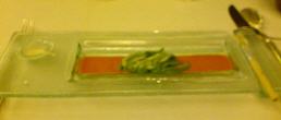 >>> Les petits pois reconstitués: Eine nichtssagende Mousse aus Erbschen, geformt wie Erbsen-Kügelchen mit etwas Milchschaum überzogen, serviert in einer Büchse mit Veyrat-Bild auf dem Deckel; nicht einmal unser Hund muß sein Futter aus der Büchse fressen ... |