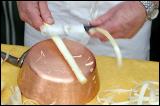 Werden die Spargeln in der klassischen Art zubereitet und serviert, darf man sie auch immer noch von Hand essen, was den Spargelgenuß eindeutig erhöht. Wieso denn das? Wenn man die Spargeln mit Messer und Gabel traktiert, schneidet man die Stange quer zum Faserverlauf und beißt mehr oder weniger längs ins Gemüse, das dann den Fasern entlang zerfällt. Ißt man sie jedoch von Hand, so behält jedes Spargelstück seine Textur, und man kann das volle Aroma kosten. Folglich gehört auch eine kleine Schale mit warmem, zitroniertem Wasser auf den Tisch sowie eine saugfähige Serviette.